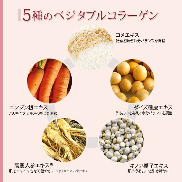 コラーゲンエキス、水、グリセリン、エタノール、BG、ベタイン、アラントイン、コメエキス、ダイズ種皮エキス、ニンジン根エキス、キノア種子エキス、オタネニンジン根エキス、ポリグルタミン酸、カタツムリ分泌液、ヒアルロン酸Na、セラミド3、水添レシチン、レシチン、PEG-40水添ヒマシ油、(アクリレーツ/アクリル酸アルキル(C10-30))クロスポリマー、TEA、EDTA-2Na、フェノキシエタノール、クロルフェネシン、トリ(カプリル酸/カプリン酸)グリセリル、オレンジ果皮油、ローズマリー油